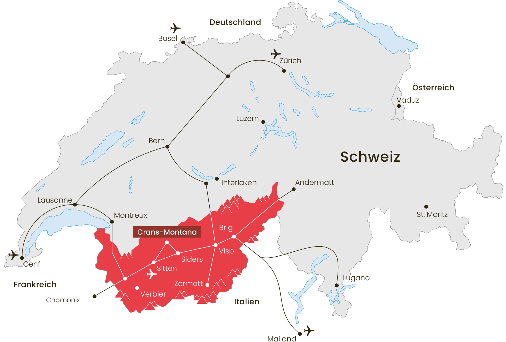 Möchten Sie per Flugzeug anreisen? Fünf internationale Flughäfen befinden sich in einer annehmbaren Entfernung von Crans-Montana und der internationale Flugfafen von Sion-Sitten ist sogar in allernächster Nähe.